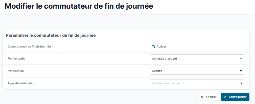 Si vous décochez la case « Commutateur de fin de journée » puis cliquez sur « Enregistrer », le commutateur de fin de journée est désactivé.