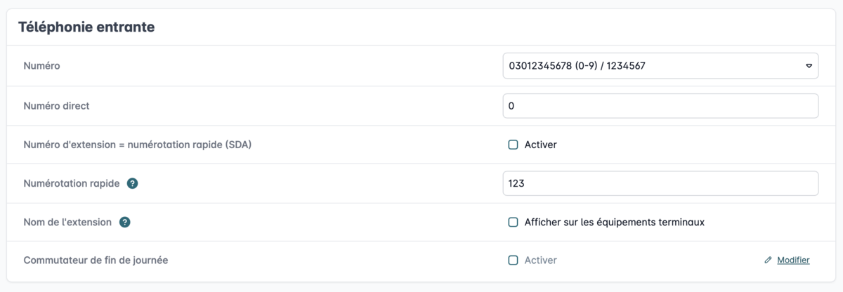 Si vous créez une nouvelle extension, vous devez choisir le bloc de numéros, attribuer le numéro direct ainsi que la numérotation abrégée interne.