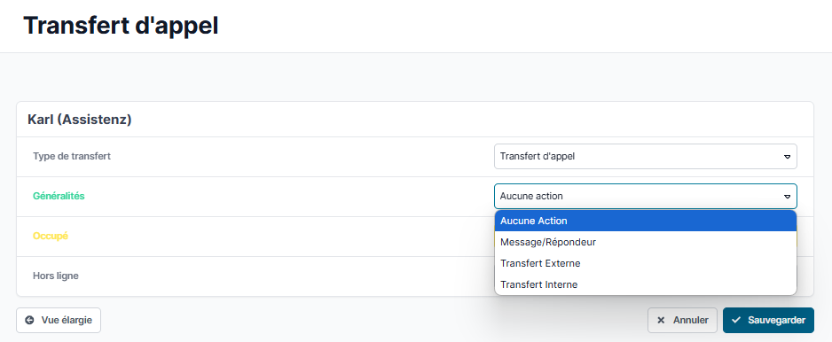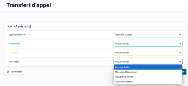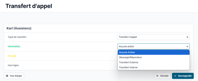 Vous pouvez ensuite définir l’une des destinations de renvoi suivantes en fonction de l’état du téléphone (Général, Occupé et Hors ligne) :