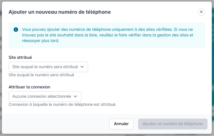 Le nombre de vos numéros ne peut pas dépasser le nombre de vos canaux voix. Ainsi, si vous avez commandé deux canaux voix et que vous souhaitez ajouter un troisième numéro de téléphone, vous devez passer à trois canaux voix. Cela ne s’applique pas aux numéros de poste configurés dans la Cloud Téléphonie.