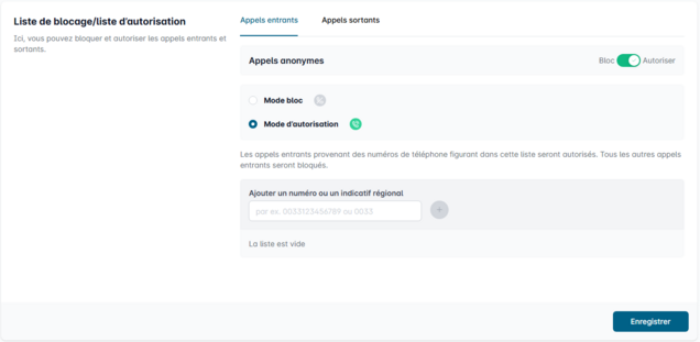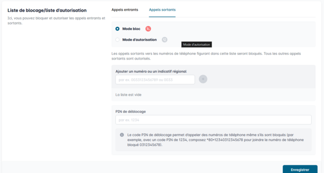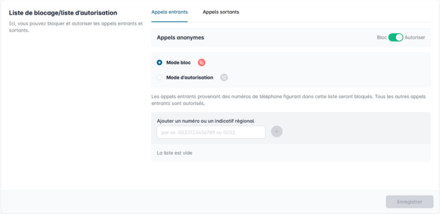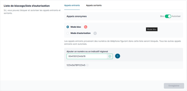 Saisissez dans le champ "Numéro de téléphone/indicatif régional" un ou plusieurs numéros que vous souhaitez bloquer ou autoriser.