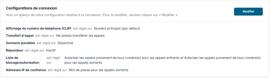 Cliquez sur la connexion pour laquelle vous souhaitez configurer un renvois d'appel et allez ensuite dans la section « Configurations de connexion » sur « Modifier ».