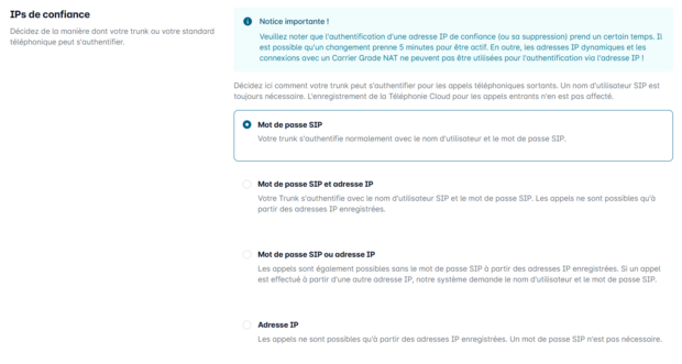 Pour les connexions sortantes, vous pouvez choisir d’utiliser Trusted IP comme sécurité supplémentaire en complément de l’authentification classique par identifiants SIP, ou bien d’opter pour une authentification exclusivement basée sur l’adresse IP.