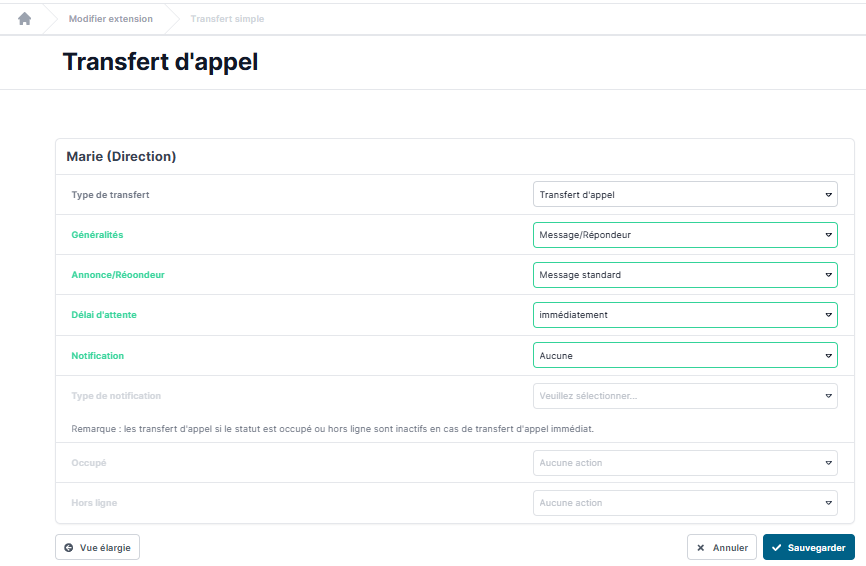 Sous « Transferts d'appels » vous accéderez alors à la configuration du renvoi d’appel pour ce numéro.