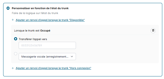 Quel que soit l’état de la ligne (libre, occupée ou hors ligne), tous les appels vers ce numéro seront redirigés vers un numéro de votre choix.