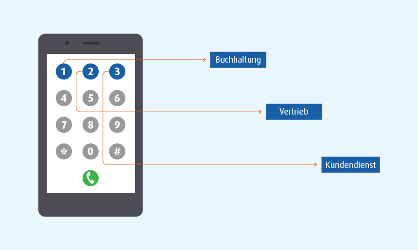 - L’appelant se voit ensuite proposer, via un message préenregistré (SVI audio), plusieurs options, chacune associée à une touche du clavier téléphonique. Il peut s’agir, par exemple, de différents services, de thèmes spécifiques, de prestations ou de types de demandes.